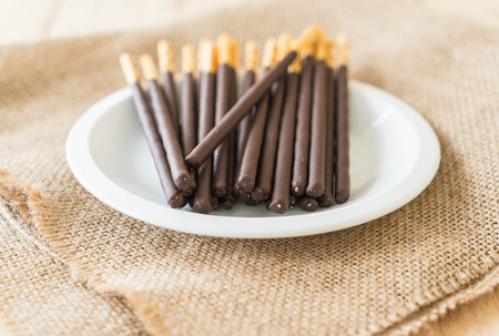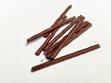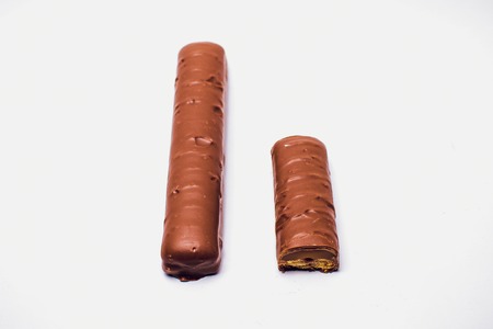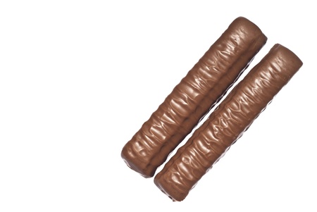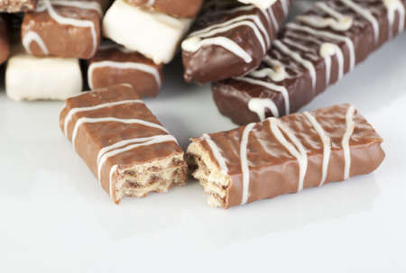 Biscuit sticks in chocolate coating on white background. Chocolate, cookies, biscuits coated bar.