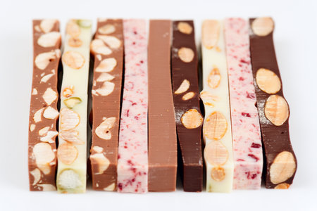 A vibrant assortment of chocolate bars featuring various textures and flavors. Each piece offers a unique taste experience, perfect for dessert lovers.