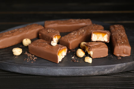 Board with delicious chocolate bars and nuts on black wooden table, closeup