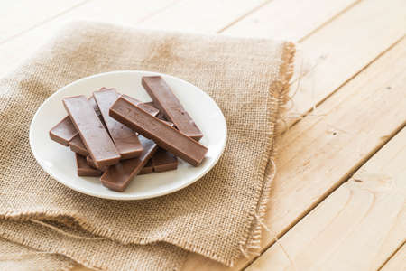 Long chocolate sticks, chocolate buttons and cocoa powder in a square plate on a gray background.