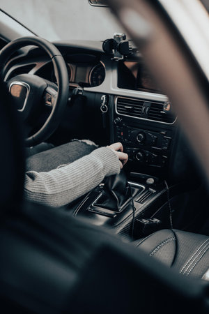 Close up of hands holding the gear of a car. Interior of a luxury car.