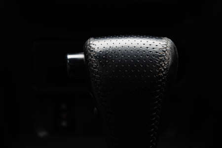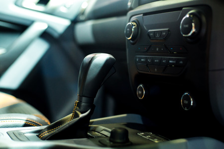 Close up of gear stick in modern car interior. Car interior details.