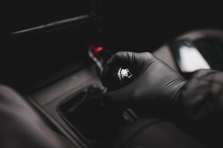 Details with the hand of a driver, in a latex glove, on an old and broken gear shift knob of a manual gearbox car during the Covid-19 pandemic.
