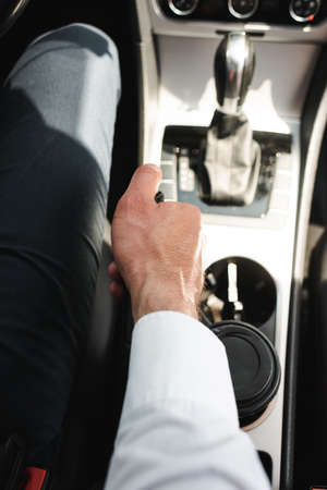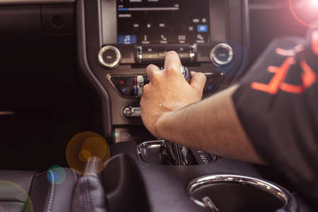 Car interior, elegant man, hand on a gear shift lever