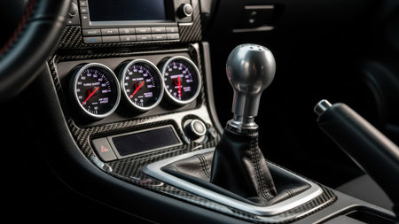 Close-up view of manual gear shift and car dashboard with gauges