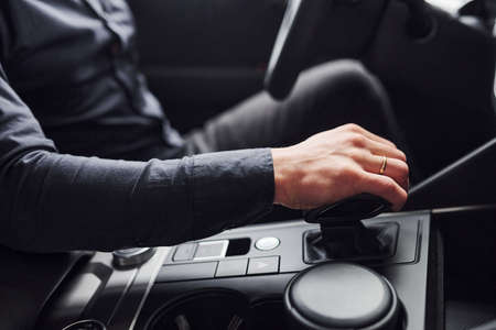 Unrecognizable young guy checking manual transmission in new car, going on test drive before auto purchase at dealership
