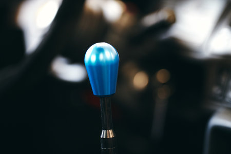 A selective focus shot of a blue shiny top of gear level