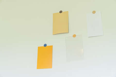 Yellow square stickers are glued to the refrigerator. Sheets for recording information. Reminders, the inscription thank you. Empty space for the text.