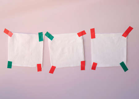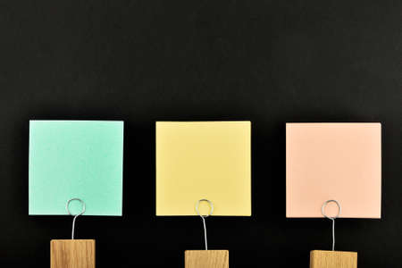 Three paper notes, green, yellow, pink, with wooden holder isolated on black paper background for presentation