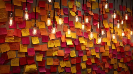 Colorful sticky notes cover wall, illuminated by hanging light bulbs. vibrant notes display various handwritten messages, creating inspiring and creative atmosphere