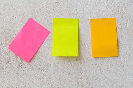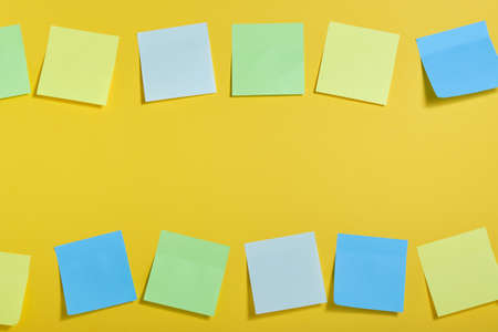 bright colored sticky notes on a yellow background in a row, copy space, selective focus