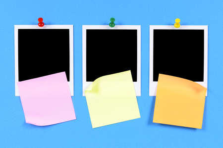 Blank photo prints with sticky notes pinned to blue craft paper.