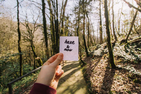 Hand Holding White Paper Card Against Fresh Nature Background. Inspirational Quote. Strive For Progress Not Perfection.