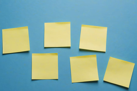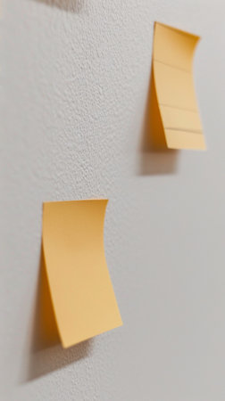 Two yellow sticky notes adhered to a textured wall, casting subtle shadows. Focus on the paper and wall texture.