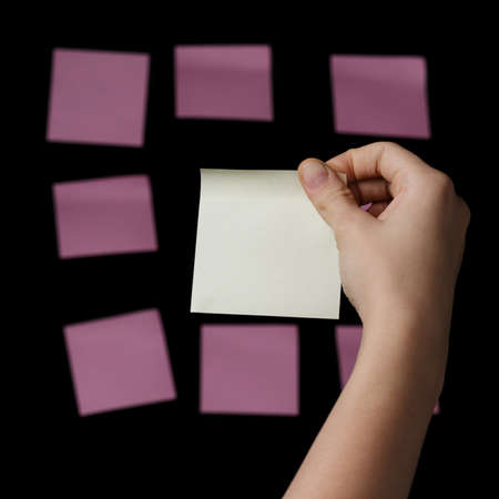 female teen hand holding yellow sticky note agains pinks, isolated on black