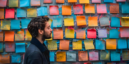 A vibrant wall covered in sticky notes displays a myriad of ideas, plans, and reminders, reflecting a dynamic approach to brainstorming and collaboration in a creative workspace.