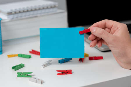 Businesswoman Holding Important Message On Note Over Desk With Lap Top And Paperclips. Woman In Suit Presenting Crutial Information On Memo. Executive Showing New Ideas.