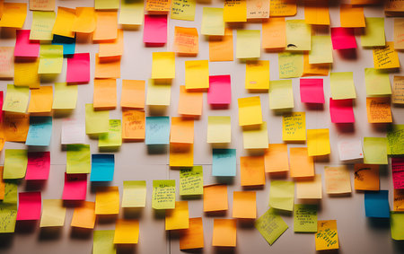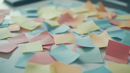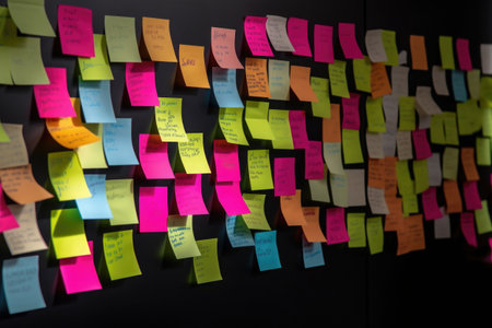 Close up of a creative brainstorming session with colorful sticky notes in a modern office setting