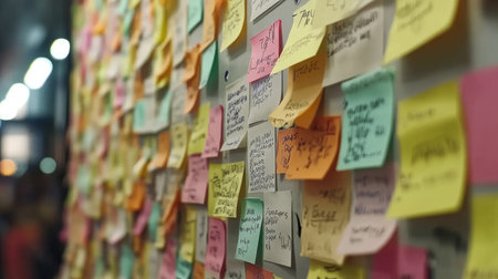 A vibrant display of sticky notes lines the wall of a creative workspace, reflecting diverse ideas and thoughts. Each note contributes to a collaborative environment.