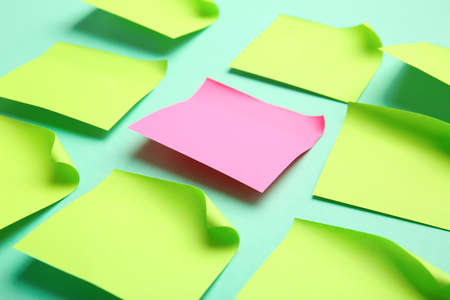 Pink paper sheet among green ones on color background. Concept of uniqueness