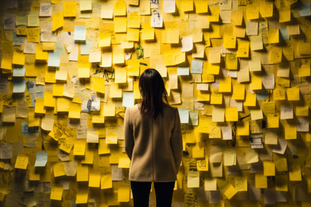 Unveiling the Mosaic of Ideas: A Woman Engulfed by a Neural Network's Photorealistic Sticky Note Wall - AR 3:2