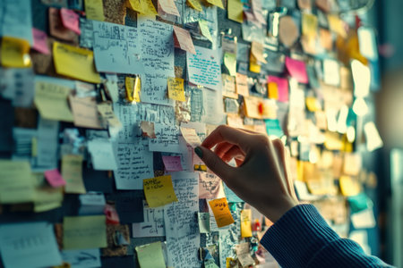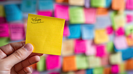 A hand is holding a bright yellow sticky note amidst a colorful array of notes on a wall, perfect for showcasing creativity, organization, and brainstorming in the workspace.