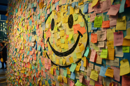 Large smiley face is made of sticky notes on a wall, creating a cheerful and positive atmosphere
