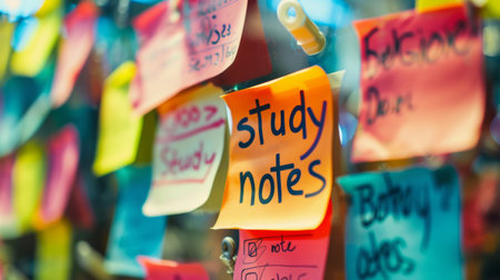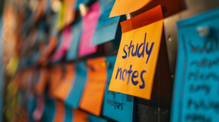 Sticky notes board in office. Many different colorful paper stickers pinned on wall. Memory notes for business planning. Created with Generative AI