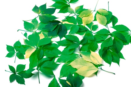 Top View Autumn season background with bright leaves colored from green to yellow. Gradient colors of the fall foliage.