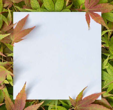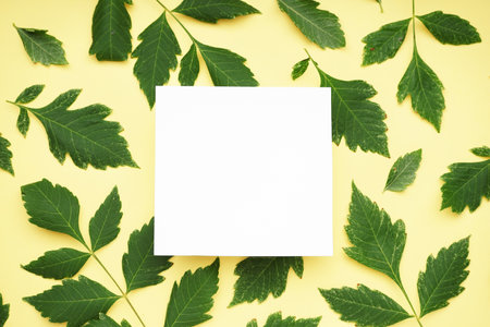 Creative mockup with green leaves with a sheet of paper for text - Invitation or banner for message -Trendy social mockup or wallpaper - Frame with greenery