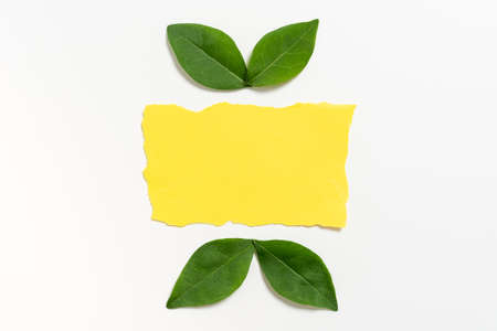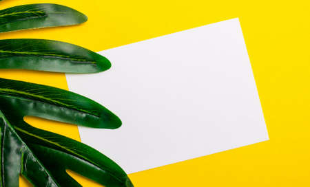 White blank sheet of paper with a place to insert text or illustrations on a bright yellow background near a green leaf of a plant. Eco natural banner concept