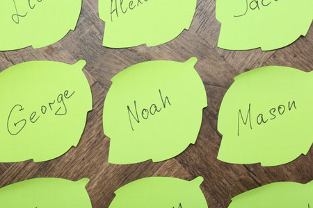 Paper stickers with different names on wooden background, flat lay. Choosing baby's name