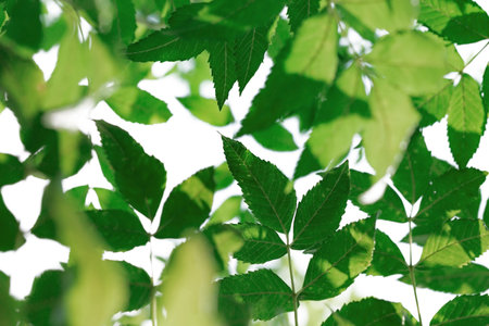 A gentle display of vibrant foliage terraced along a slender twig, illuminated by tender daylight that weaves shadow patterns on a subtle, muted backdrop.