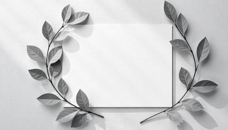 Blank Paper Arranged With Leaves Representing Business Promotion. Empty Rectangular Frame With Fresh Botany Decorated For Business Template And Advertisement.
