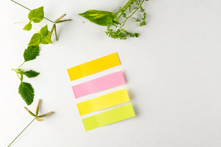 A flat lay featuring colorful sticky notes arranged alongside vibrant green leaves against a white backdrop, showcasing a mix of creativity and nature-inspired design elements.