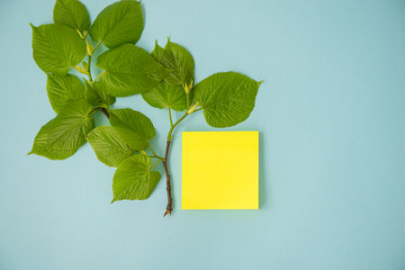 A blank sheet, a yellow sticker, a top view, a branch with green leaves on a bright blue table. mockup. Space for text and copy space