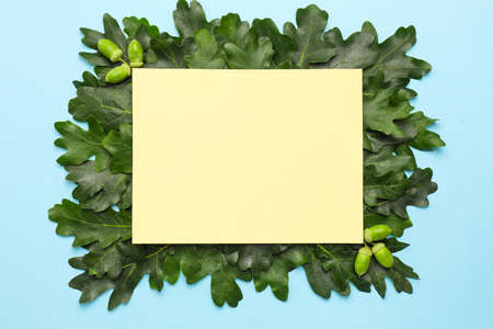 Creative layout made of fresh green leaves with paper card note. Flat lay. Nature concept. Place for text.