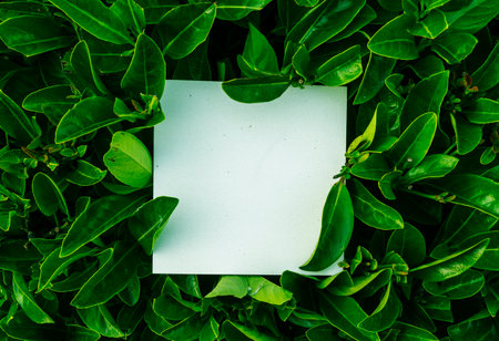 creative layout composition frame made of green periwinkle leaves with beautiful texture, with paper card note, flat lay and copy space