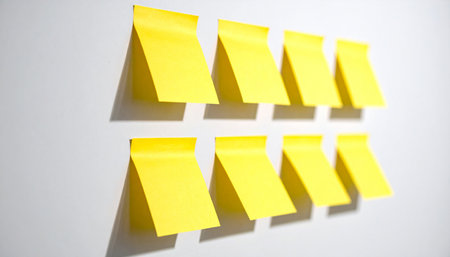 Ten vibrant yellow sticky notes are affixed to a white wall in two distinct rows, casting subtle shadows that add depth to the composition.
