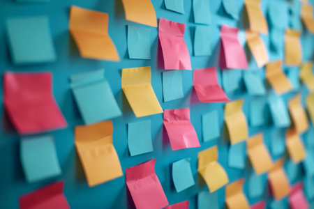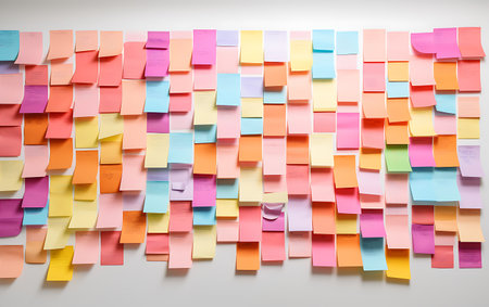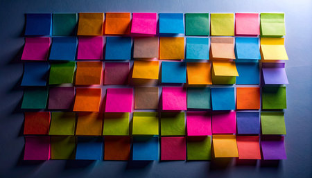 A vibrant display of colorful sticky notes arranged neatly on a wall, creating a cheerful and organized workspace. Perfect for inspiring creativity and ideas.