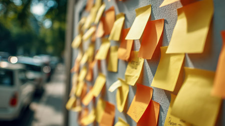 A vibrant collage of sticky notes in various colors hangs against a transparent backdrop, showcasing creativity and inspiration in a bustling urban setting, perfect for office or workspace themes.
