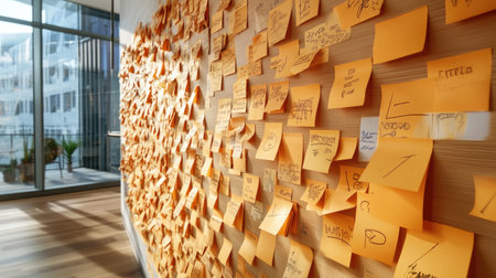A vibrant wall in a modern office space is filled with colorful sticky notes, showcasing creativity and collaboration in idea generation and planning.
