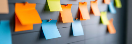 A close-up view of colorful sticky notes pinned on a project management board in a contemporary office, illustrating effective organization and collaboration in a professional space.