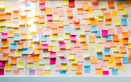 Vibrant, colorful sticky notes arranged on a wall, illuminated by soft sunlight, creating a playful and organized atmosphere in a creative workspace.