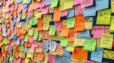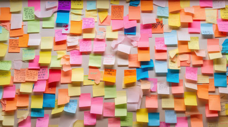 A vibrant collection of sticky notes in multiple colors fills a wall, showcasing an organized display of ideas, reminders, and creative expressions in a collaborative workspace.