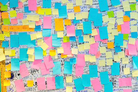Close up of wall covered with lots of sticky notes in different colors, communication through writing.