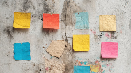 Brightly colored sticky notes in various sizes are stuck to a weathered wall covered in textures and stains. This scene reflects creativity and the organization of ideas in an informal setting.