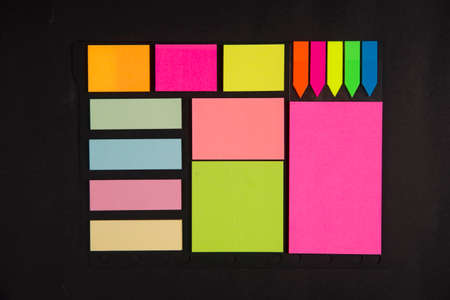 Stationery stickers close-up and copy space. Notes for remind. Sticky notes on a black board in the form of a frame.