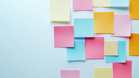 A vibrant arrangement of multicolored sticky notes on a white background, perfect for conveying ideas, reminders, and organization in a creative setting.