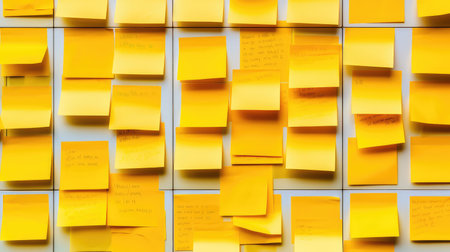 Sticky notes board in office. Many different colorful paper stickers pinned on wall. Memory notes for business planning. Created with Generative AI